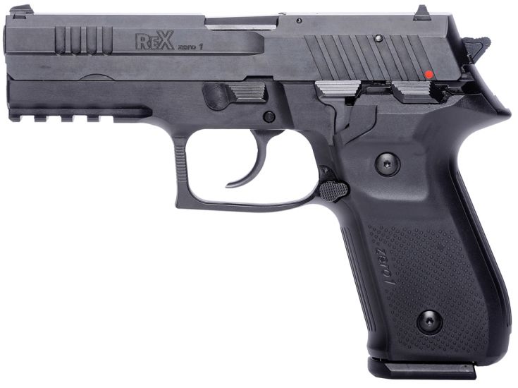 Caliber: 9mm Luger (9x19mm) – Operating Principle: Short recoil – Action Type: Modified Browning linkless locking system – Trigger System: Single- and Double-action Hammer fired – Length: 7.7 in – Barrel Length: 4.3 in – Height: 5.7 in – Width (slide): 0.98 in – Width (frame): 1.1 in – Width (safety levers): 1.46 in – Weight (without magazine): 29 oz – Weight (empty magazine): 3 oz – Magazine Capacity: 17 – Trigger Pull SA: 5.5 lb – Trigger Pull DA: 13 lb – Trigger Travel DA: 0.5 in – Reset Travel SA: 0.16 in – Barrel Pro?le/Twist: 6 grooves right-hand twist – Barrel Twist Rate: 9.8 in – The Rex Zero 1S pistol complies with strict military standards for reliability and has passed extreme temperature hostile environment and drop tests. The expected service life for the pistol exceeds 30000 rounds.
