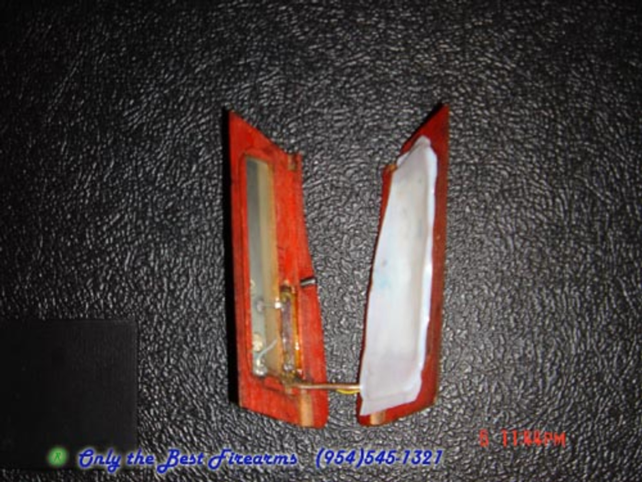 It’s A Belgium Browning Hipower. The Grips Were Hollowed Out To Install An FM Wireless Transmitter. The Transmitter Is Activated When A Special Magazine Is Inserted. There Is A 9 Volt Battery Installed In The Base Of The Magazine. This Special Magazine Can Hold 3 Rounds Of Standard 9mm Ammunition. When The Magazine Is Inserted Into The Weapon, The FM Transmitter Is Activated And Broadcasts To A Speical Receiver That Has A Plug For An Earpiece, Or An External Speaker. The Best Part About This, Is That The Gun Is Fully Functional. If The Agent Got Into Serious Trouble, All He Needed To Do Is Drop The Mag With The Battery, And Insert A Standard Magazine For 13 Rounds Of Firepower. This Was Designed For Use In The Field By CIA Agents Operating Undercover Who Needed To Be Monitored, But Couldn’t Wear A Standard Wire. Comes Complete With Fitted Case Holding Everyting. Wow!