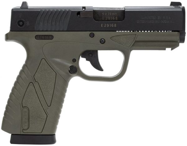 This model is chambered in 9mm and has a OD green frame with a black finished slide.