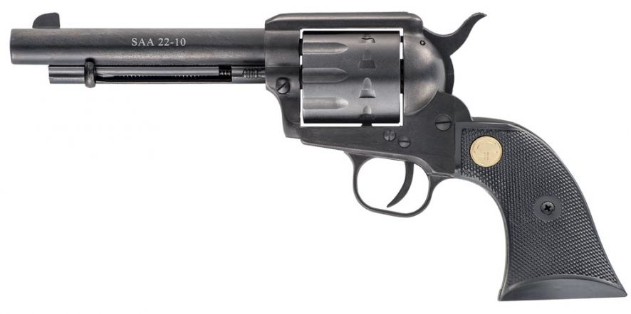 A 10-shot version of the classic Single Action in caliber .22LR. Three barrel lengths are available (4 3/4, 5 1/2, 7 1/2). Sights are fixed except on the 7 1/2 barrel model. One of the most accurate reproductions of the 1873 Single Action. While maintaining the true to form classic design, this Single Action revolver is a hybrid of modern technology and manufacturing with the feel of the Old West. This revolver is crafted with a steel rifled barrel, with most of the mechanism and components constructed from a special formulated alloy that offers greater ductility and flexibility assuring long lasting reliability and durability.