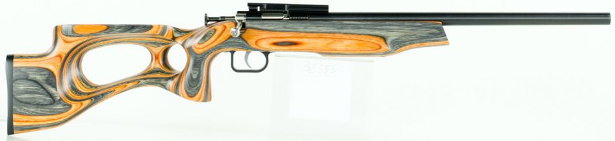 Cricketts Single Shot 22 LR rifle features a orange and black laminate stock, adjustable rear sight, and a bolt action constructed from alloy nickel plated steel.