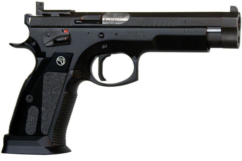 Action: SA – Caliber: 9mm – Magazine Capacity: 20/26 – Magazine Type: Double Stack – Frame: Steel – Grips: Thin Aluminum – Sights: Fixed/C-more – Barrel: Cold Hammer Forged – Barrel Length: 5.400 in – Weight: 3.000 lbs – Overall Length: 10.470 in – Height: 5.510 in – Width: 2.440 in – Safety: Ambidextrous Manual Safety Safety Stop on Hammer – The Czechmate is based on a modified version of the CZ 75 TS frame. It comes with all parts necessary to run in IPSC Open or Limited division (both in 9mm). The Czechmate comes configured for Open division competition with a compensator and C-More red dot sight installed. The included front sight adapter replaces the compensator and the included rear sight replaces the slide racker handle when switching from Open to Limited configuration. A big stick 26-round magazine and 3 20-round magazines are included in the CZ hard case. – C-more slide-ride non-click 6 moa dot – Ambidextrous slide racker – 3 20-round magazines – 1 26-round magazine – 4 port compensator – Aluminum grips – Aluminum magwell – Competition hammer – 2 slide stops with slide lock – 4 slide stop pins without slide lock – Undercut trigger guard and beavertail for high grip – When configured with the compensator the CZ 75 TS Czechmate model is designed to use ammunition that meets the minimum requirements for IPSC major power factor. The minimum power factor for major in IPSC open class competition is 160. Power factor is calculated by the following formula: – Power Factor = (bullet weight (in grains) X muzzle velocity (in feet per second))/1000 – IPSC minimum power factor for major is 160 – USPSA minimum power factor for major is 165