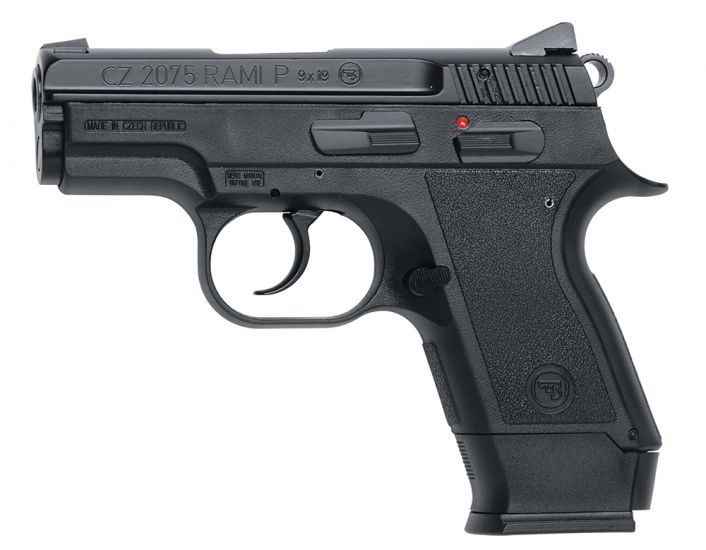 The CZ 2075 Rami is a sub-compact semi-automatic based on the proven CZ 75 line of pistols. The trigger mechanism operates in selective DA and SA mode depending on the shooters preferences. Several safety devices are used including a firing pin block and a manual safety. Incorporating the CZ double stack magazine design, the little Rami accommodates 10 rounds of 9mm Luger, or 8 rounds of 40 S&W, plus 1 in the chamber. With a 3″ barrel, and unloaded weight of less than 25 ounces, the black poly coat, alloy frame Rami is ideal for concealed carry.