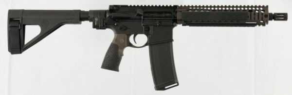 Daniel Defenses MK18 Pistol is a variation of the MK18 SBR. It is equipped with a SB-Tactical SOB Pistol Stabilizing Brace and a Daniel Defense pistol grip with an integral trigger guard and soft touch overmolding. The direct impingement, carbine length, low profile gas block is CNC machined from 4140 hardened steel with a Mil-Spec heavy phosphate coating. Its 10.3 barrel is constructed of chrome moly vanadium steel that is chrome lined with a heavy phosphate coating and a nitride finished flash suppressor. The Mil-Spec upper and lower receivers are CNC machined of 7075-T6 aluminum, with a hard coat anodized finish. The MK18 pistols handguard is also CNC machined from 6061-T6 aluminum, with a hard coat anodized finish and rail panels made from heat resistant Santoprene.