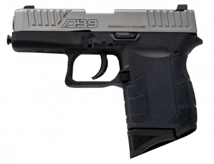 Diamondback Firearms is proud to present the DB9, a micro-compact 9mm pistol made entirely in the USA. Designed with safety in mind, the DB9 features a “ZERO-Energy” striker firing system with a mechanical firing pin block, a steel magazine catch to secure a sheet metal magazine and real windage-adjustable sights, all in a lightweight pistol. A steel trigger with dual connecting bars allows for a crisp, smooth, trigger pull. The DB9 features a FEA (Finite Element Analysis) designed slide and barrel that is stronger than any comparable firearm, resulting in durability with less felt recoil, and the absence of removable pins or tools makes field stripping easier than ever. The slide, barrel, and internal parts are coated to resist corrosion, making this pistol a lifetime investment.