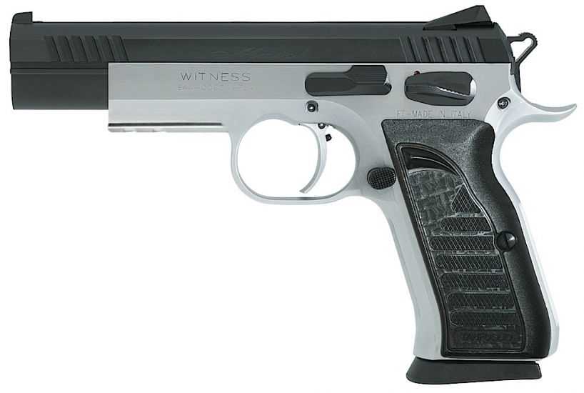 The Witness Elite Match features a 4.75 polygonal rifled barrel, single action trigger with overtravel stop, fully adjustable sights, extended safety, extended magazine release, and integral accessory rail. It has a two tone finish with a stainless frame and a black slide. It is available in 9mm, 10mm, .40 S&W, 38 Super or .45 ACP.