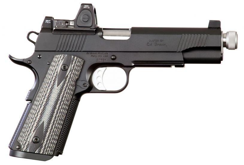 Ed Browns Special Forces Gen 4 *CA Compliant* pistol is built for pure performance and extreme use. The forged carbon steel frame and slide are coated with black Gen4 coating, and has a beavertail grip and ambidextrous extended tactical thumb safety. The premium match grade barrel has solid steel bushing for the highest accuracy, and has fixed dovetail 3-dot night sights with high visibility white outlines.