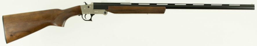 This 410 gauge single shot shotgun features a silver receiver finish and a vent rib barrel with a blued metal finish. It also has a brass bead front sight and a cross-bolt safety.