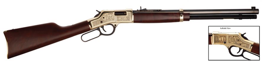 The American Oilman Tribute Edition Rifle from Henry honors those who dared to dream and labored to make it a reality. Adventurer, explorer and ultimate risk-taker, the American Oilman continues to inspire and define what it means to be a wildcatter. To honor this inspiration, Henry Repeating Arms is proud to introduce the American Oilman Tribute Edition. The American Oilman continues a tradition of exploration and technological development that lessens our dependence on foreign oil and reduces our footprint in the field. We salute those who blaze the trail today; the driver of the tank truck, the foreman in the field, the well-treater, the geologist, the engineer. They are the American Oilman – still exploring, innovating and propelling the American oil industry into the future. On the left side, the front panel displays the mighty image of the derrick towers standing like sentinels in tribute to oilman past and present. On the rear panel, two roughnecks tripping pipe complement the banner text THE AMERICAN OILMAN. Features a custom serial number range starting with OIL00001. On the right side of the front of the solid hardened brass receiver theres a one-of-a-kind drawing of a pump jack, the modern and ever-present workhorse of the onshore oil fields. A rig is stunningly engraved in a masculine antique black fill on the rear. The checkerboard patterned border with an open American style scroll is a nod to our heritage.