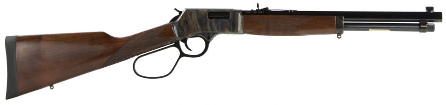 This Big Boy Carbine Color Case Hardened model is chambered in 45 Colt and features a case hardened receiver finish, American Walnut stock, a blued octagon steel barrel, and adjustable semi-buckhorn rear and brass bead front sights.