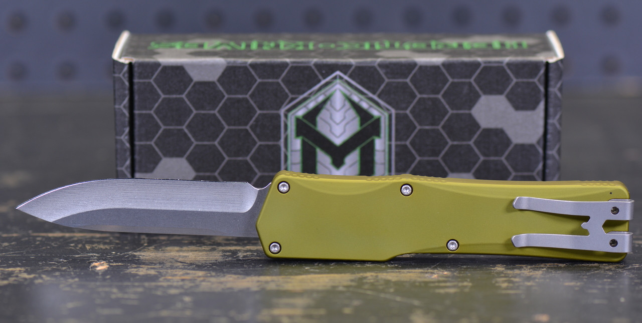 Heretic Knives Cleric Clip Point OTF Automatic Knife Green Handle, 3.5″ Stonewash Blade