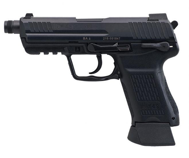 Originally developed for the U.S. militarys next generation handgun competition, the HK45 Tactical comes standard with a threaded barrel and three-dot tritium night sights. It is made at HKs American manufacturing facility in New Hampshire using American and German components. The HK45 Tactical uses a 10-round steel magazine and has a Picatinny MIL-STD-1913 rail molded into its polymer frame for mounting lights and accessories. The HK45 Tactical has a proprietary internal mechanical recoil reduction system that employs a flat recoil spring in tandem with a polymer bushing sleeve to reduce the recoil forces effecting the operator and the weapon, improving shooter control during rapid firing and prolonging component service life. An O-ring on the threaded barrel means better slide-to-barrel lockup and enhanced accuracy. Each HK45 CT comes standard with an extra back strap for a custom fit for each shooters hand.