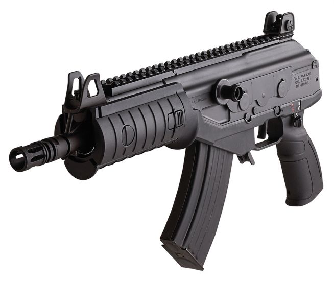 Action: Semi Auto – Caliber: 7.62x39mm – Capacity: 30 – Finish: Black – Sights: Adjustable – Stock: Folding – Twist: 1:9.45 – Barrel Length: 8.3 – Overall Length: 26.75 – Weight: 6.5 lb – Charging handle (reciprocating) moved to the left side of the milled steel receiver allowing for weak hand operation – Weight reduction with the use of modern polymers – AKM/AK-47 magazine compatibility – Full length 2-piece Picatinny top rail – Picatinny tri-rail forearm with built in slide on/ off rail covers with pressure switch access – Fully adjustable iron sights with Tritium front post