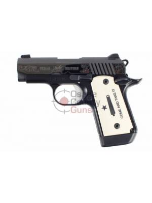 1836 unit limited edition model with western leaf and scroll engraving with saw tooth border on slide, bonded ivory grips with the Battle of Gonzales motto “Come and Take It” on left panel and State of Texas with state flag insert on right panel.