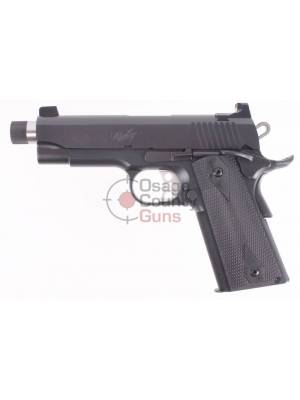 Stainless steel match grade barrel threaded for suppression with black synthetic double-diamond grips.