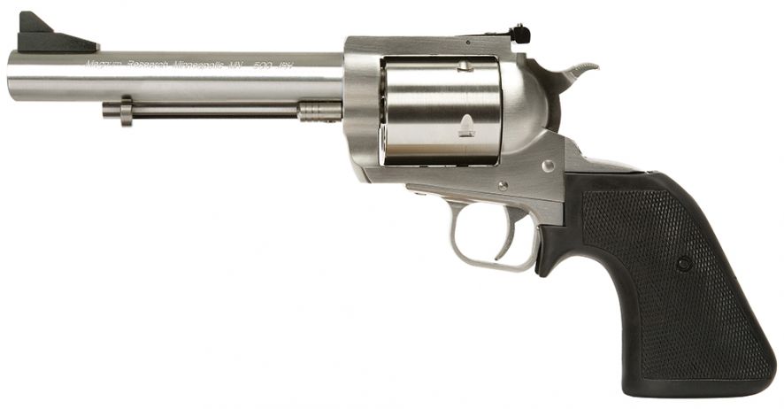 MRIs Big Frame Revolver is the biggest, finest revolver on the market today. Entirely manufactured in the US, it is designed as a magnum from the ground up. The BFR is all stainless and has a cut rifled barrel that delivers unmatched accuracy with lead or jacketed bullets. The BFR is the most powerful production single action gun made. With multiple calibers to choose from, you can take everything from grouse to grizzly. It has a factory fixed, black front sight and an adjustable rear sight. This model has a short cylinder, brushed stainless steel finish with black rubber grips, and comes with a Weaver-style scope mount.