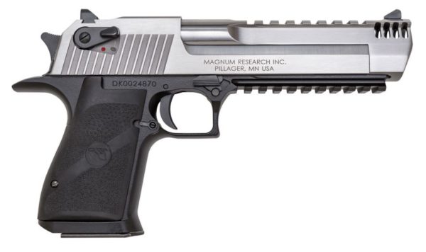 The construction of the Mark XIX Desert Eagle pistol utilizes the latest CNC machine technology providing exacting specifications with tight tolerances creating a work of art in a precision firearm. The grip is anatomically formed and provides an ideal hand seating angle for two-handed shooting, allowing for comfortable, rapid and accurate firing. The Weaver style accessory rail easily allows for aftermarket optics and scope rings.Weaver Style Accessory Rail and Integral Muzzle Brake (L6)