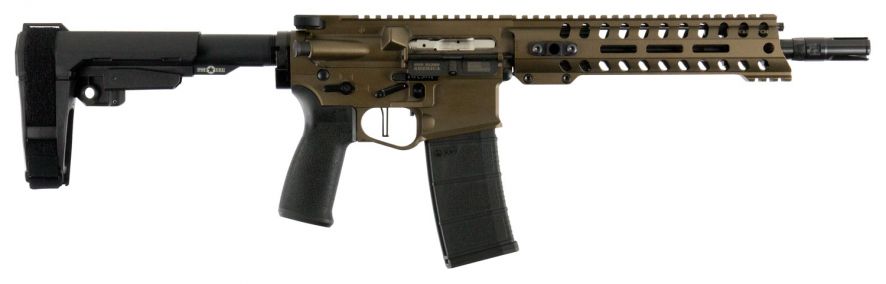 Patriot Ordnance Factory Renegade Plus, Semi-automatic AR Pistol, 223 Rem/556NATO, 10.5″ Puritan Barrel, 1:8 Twist, Burnt Bronze Finish, SB Tactical SBA3 Brace, 30Rd, MLOK Renegade Rail, Triple Port Muzzle Brake, POF-USA 3.5 lb Drop-In FLAT Trigger, Ambidextrous, 1 Magazine 00996
