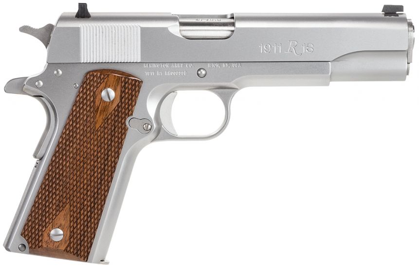 Remingtons Model 1911 R1 is a fine blend of exacting craftsmanship and out-of-box performance. It features a crisp trigger, dovetailed front and rear sights, precision-machined slide and frame, and Double Diamond checkered American walnut grips. It ships with two 7-round magazines.