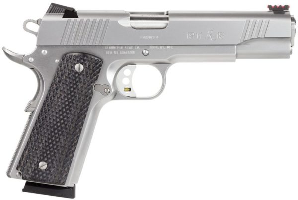 Remingtons Model 1911 R1 Enhanced is a fine blend of exacting craftsmanship and out-of-box performance. It features a precision-machined slide and frame with front and rear slide serrations and front grip strap serrations. The frame also has a crisp, anodized aluminum match trigger, match grade stainless barrel and bushing, enhanced hammer, a beavertail grip and thumb safety, and a flat checkered mainspring housing. Its slide features a red fiber optic front sight, adjustable rear sight. The R1 Enhanced comes with custom enhanced wood laminate grips with a thumb groove and ambidextrous cut. It ships with two magazines with a bumper pad.