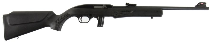 Rossis RS22 semi-automatic features an 18 free-float barrel with adjustable fiber optic sights, synthetic Monte Carlo stock, and a detachable magazine.