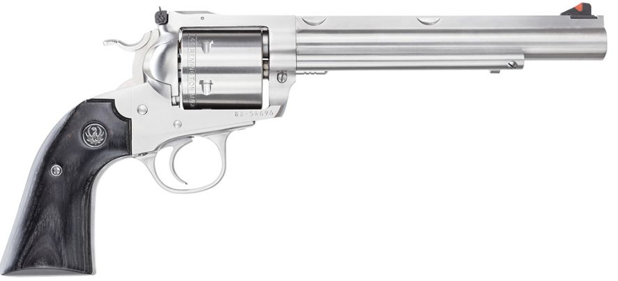 This model has a 7.5 stainless steel barrel, frame, and cylinder. It also has a Bisley black laminated grip.