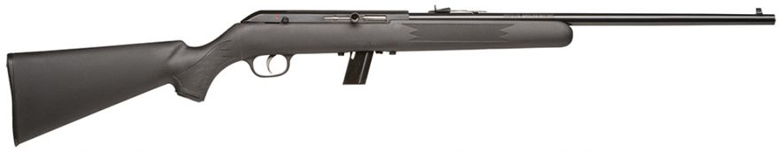 The Savage Arms 64F semi-automatic rifle is chambered in 22LR and has a 10+1 capacity. It has a carbon steel blued finish barrel that is drilled and tapped for scope mounts; and a synthetic matte black stock.