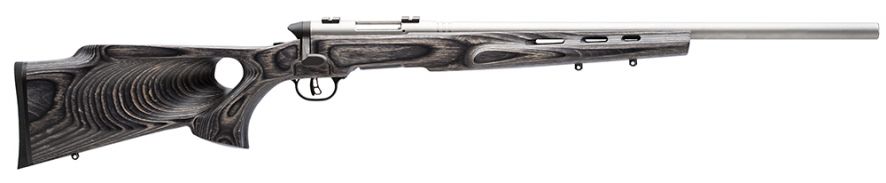 The Savage Arms B.Mag Target rifle is chambered in 17 Winchester Super Magnum with a 8+1 capacity. It has an 22 stainless steel barrel and gray laminated thumbhole stock. The receiver and barrel have a stainless finish.