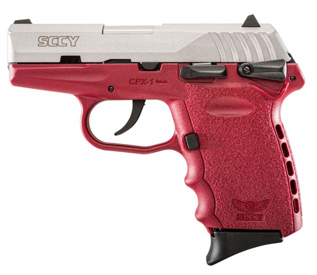 SCCYs CPX-1 is designed for concealed carry but large enough to get a good firm grip. It is considered to be one of the best priced, precision made Pocket Pistols on the market. Chambered for 9mm, it has a 3.1 barrel with a 16:1 right hand twist. The receiver is made from 7075 T6 aircraft grade heat treated aluminum alloy. The Zytel polymer frame features ergonomic finger grooves and an integral recoil cushion on the backstrap. The slide is machined from stainless steel with a Zytel overmolded polymer extension for ease of operation. It has 3-dot sights with a windage-adjustable rear. This DAO has an internal hammer with inertial firing pin to prevent accidental discharge, and an external thumb safety with a guard molded into the frame. It has a smooth, consistent 9-pound trigger pull. It comes with two 10-round magazines with finger extensions bases installed and two flat magazine bases. The CPX-1 has a satin slide with a crimson frame.