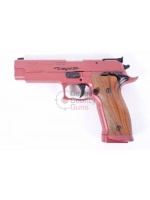 Features – 9mm – Stainless frame & slide – Adjustable single action trigger – 5” barrel – Low profile integrated adjustable competition sights – Ruby Red pearl Ilaflon Coating (slide, frame, magwell & mag extensions) – Black colored hammer, control levers & grip plate screws – Custom wood grip plates – Magwell – 19 round magazines (2)