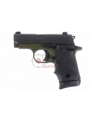 This model features Army Green Anodized frame, black rubber grips, night sights, and one 7-Round Extended magazine.