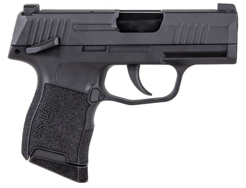 The P365 Air Pistol features a full blowback metal slide and has a CO2 loading 12 round magazine. It also has green high visibility 3-dot fixed sights, and manual safety.