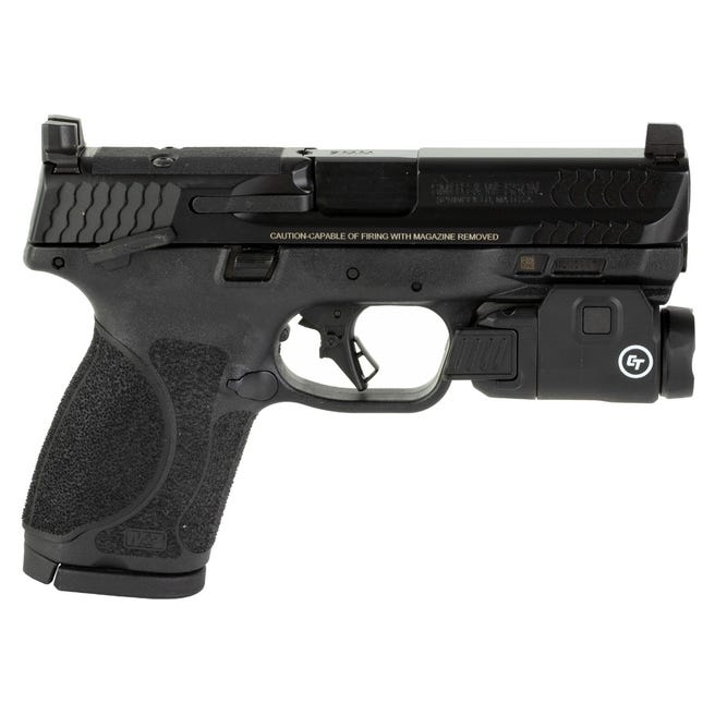 The Smith & Wesson M&P9 M2 Compact is a versatile, precise, and reliable handgun that is great for conceal carry, personal protection, or competitive shooting. It comes chambered in 9mm with a 4 inch barrel. Features include an optics ready slide with 7 mounting plates, front slide serrations, a Picatinny accessory rail, and two 15 round magazines. Includes a Crimson Trace rail light. Buy guns online from the best online gun store today at the best price from GrabAGun!