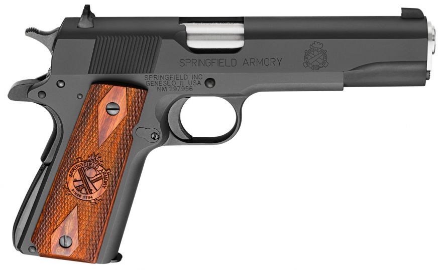 The 1911 Mil-Spec is built on a full-size frame and slide with a match grade, carbon steel parkerized 5 barrel. Its slide features rear slanted serrations. The mainspring housing is the original arched style found on GI issue 1911-A1s, but it includes the Springfield Armory I.L.S. This pistol also has a standard spur hammer and standard grip safety. The single-sided, non-extended thumb safety and short military combat trigger are true to the original 1911-A1 design. Each Mil-Spec comes with a beautiful pair of cross-cannon emblazoned Cocobolo grips that are held in place with slotted grip screws.