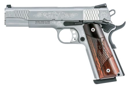 Smith & Wessons 1911 SAO features beautiful machine scroll engraving on the stainless steel slide and frame with a matte glass bead metal finish. It has a 5 barrel, wooden laminate grips, and white dot sights. The Engraved 1911 includes wooden presentation case.