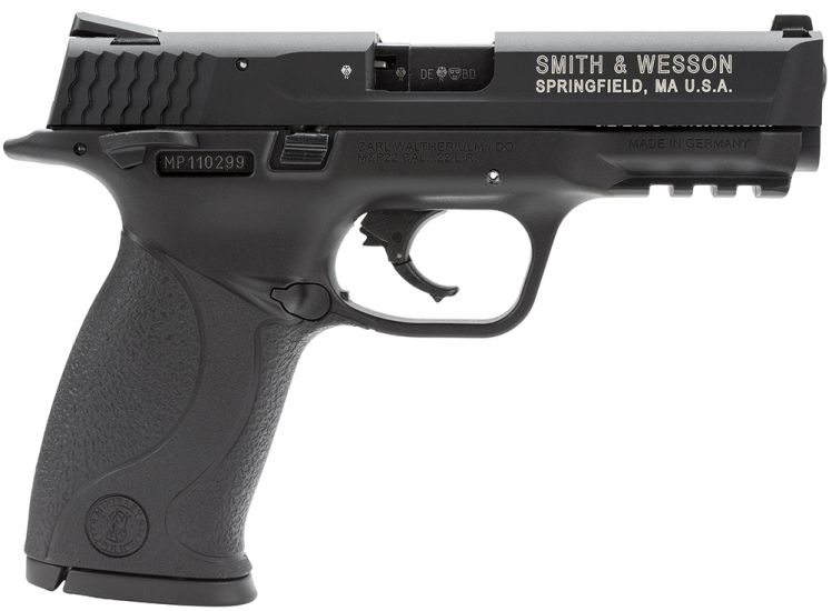 This M&P22 model has a black polymer frame with a Picatinny rail and black Armornite aluminum slide with a drift-adjustable front sight with click-adjustable rear sight. The 4 barrel has M8x.75mm threads. It includes a 12-round magazine.