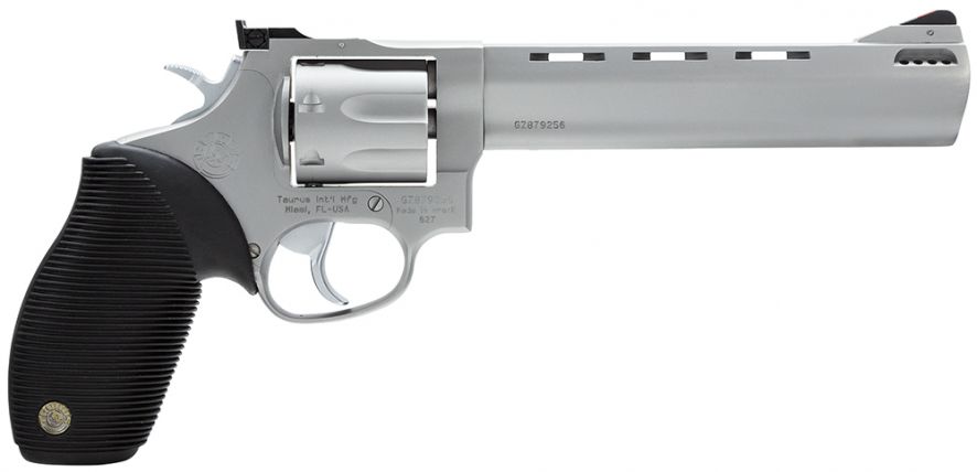 Extremely comfortable to fire and easy to control, the Tracker Series maintains a high level of accuracy, rock-solid performance, and near-indestructible construction. The Model 627 revolver 357 Magnum has a 7-round cylinder, and makes a practical choice for backpacks and tackle boxes, especially where there are bears and other predators around. It has a transfer bar safety as well as the Taurus Security System. The 627 features factory-tuned barrel porting and a gas expansion chamber for recoil, as well as the ergonomic, shock-absorbing Ribber grip. It has a matte stainless steel metal finish with a fixed front sight and adjustable rear sight.