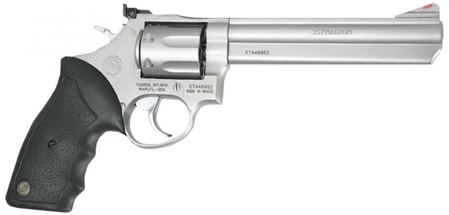 The .357 Magnums have comfortable rubber grips and deep, lustrous finishes. The Model 66 has adjustable target sights and a seven shot cylinder. Available in matte stainless steel or blue steel with 4 or 6 full underlug barrels, all carry the Taurus Security System and unlimited lifetime repair policy.
