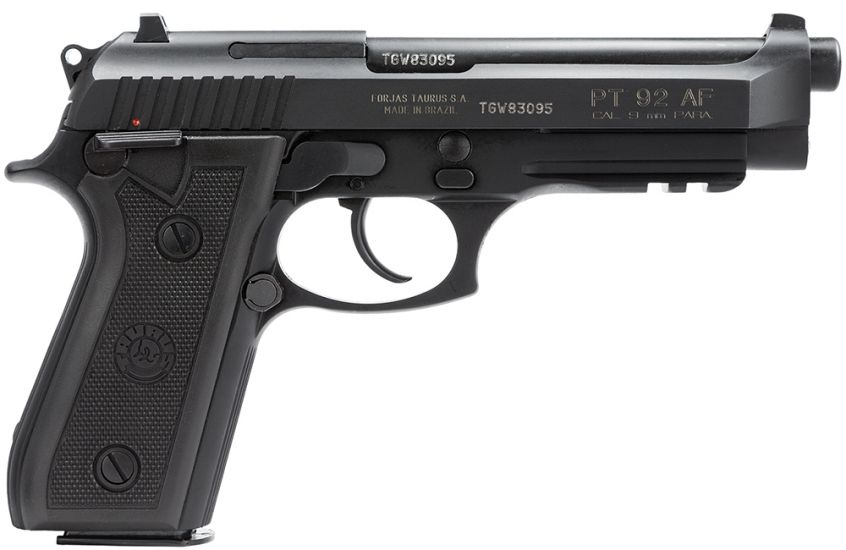 The Taurus 92 pistol was created to improve on the Beretta design. The specially-designed drop hammer-forged ordnance-grade alloy frame wont crack or allow the slide to come off, and a three-position frame-mounted ambidextrous safety allows for a classic SA cocked-and-locked mode and also functions as a DA decocking lever. The Taurus 92 also features a loaded chamber indicator, the Taurus Security System, a Picatinny rail, and fixed 3-Dot sights.