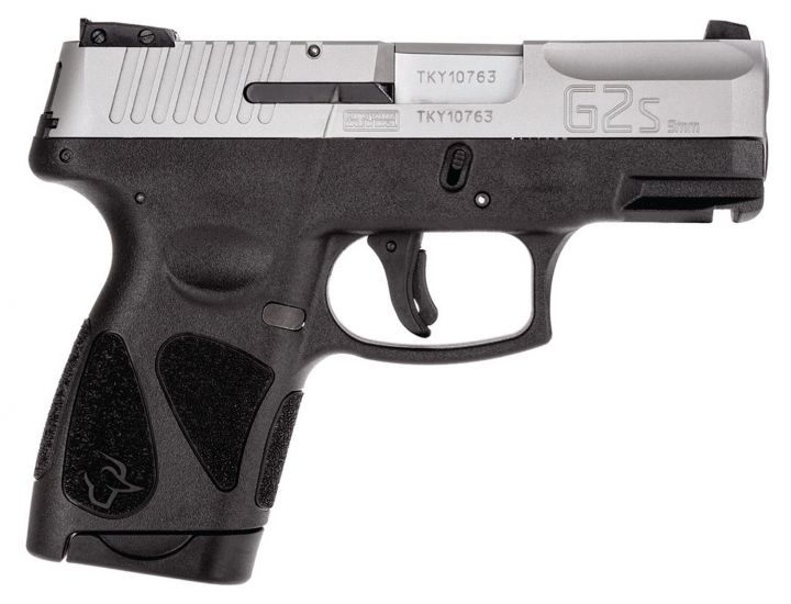 This G2S model has a black frame with a matte stainless steel slide. It includes two 6-round magazines.
