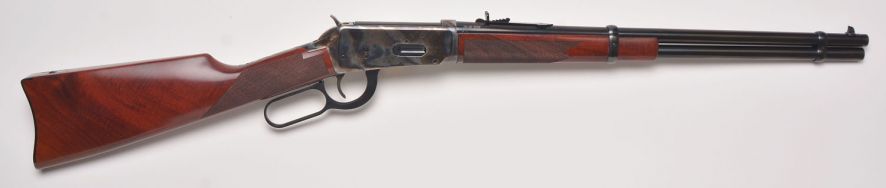 This 38-55 Winchester model has a 20 blued round barrel, case-hardened forged steel frame, carbine style butt stock and forend with checkering.