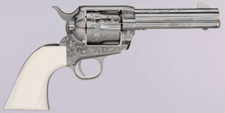 The Outlaw Legacy was designed with the Outlaw Gang to combine beautiful finish features with their slogan God-Guns-Freedom. It has plain ivory grips.