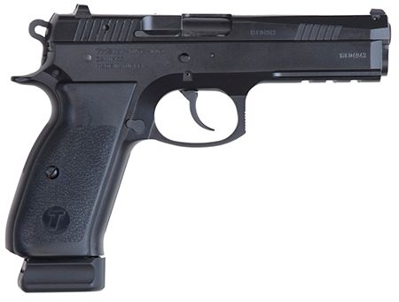 TriStars P-120 features a steel frame and slide with a black Cerakote finish. The frame has a Picatinny rail and black polymer checkered grips. Its slide has a rear dovetail sight and a fixed blade front sight.