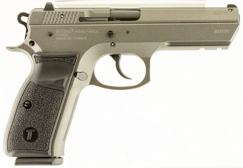 TriStars T-120 features a aluminum frame and steel slide with a Tungsten Cerakote finish. The frame has a bottom rail and black polymer checkered grips. Its slide has a rear dovetail sight with a fixed blade front sight.
