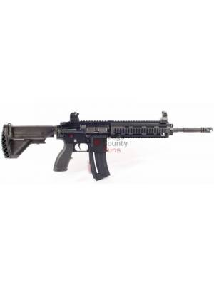 The HK 416 series rifle was designed for U.S. special forces as an alternative to the M-16 variant standard issue weapons. The 416 D145RS Semi-Automatic Rifle features a quad rail forend, retractable buttstock with storage compartment, and Rail Interface System. The HK 416 D145RS Semi-Automatic Rifle in .22 L.R. is manufactured exclusively by Walther under license from HK. It is the only genuine HK tactical rimfire replica available in the world.
