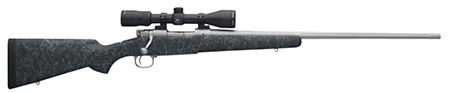 The Model 70 Extreme Weather Stainless utilizes a Bell and Carlson lay-up composite stock that provides a solid feel and features trim and lightweight ergonomics. It has a textured charcoal gray matte finish for rugged good looks and improved grip in adverse conditions. The sculpted cheekpiece helps insure proper eye-to-scope alignment from any shooting position. The thick, black Pachmayr Decelerator pad helps take the felt recoil bite out of high performance magnum cartridges. Like all Model 70s today, it features the Pre-64 type claw extractor with Controlled Round Feeding so the cartridge may be easily withdrawn from the chamber at any point after it leaves the magazine. The Extreme Weather SS rifles free-floating, fluted stainless steel barrel is made in the same factory as those found on U.S. military rifles and machine guns, and features a recessed target crown to protect the rifling.