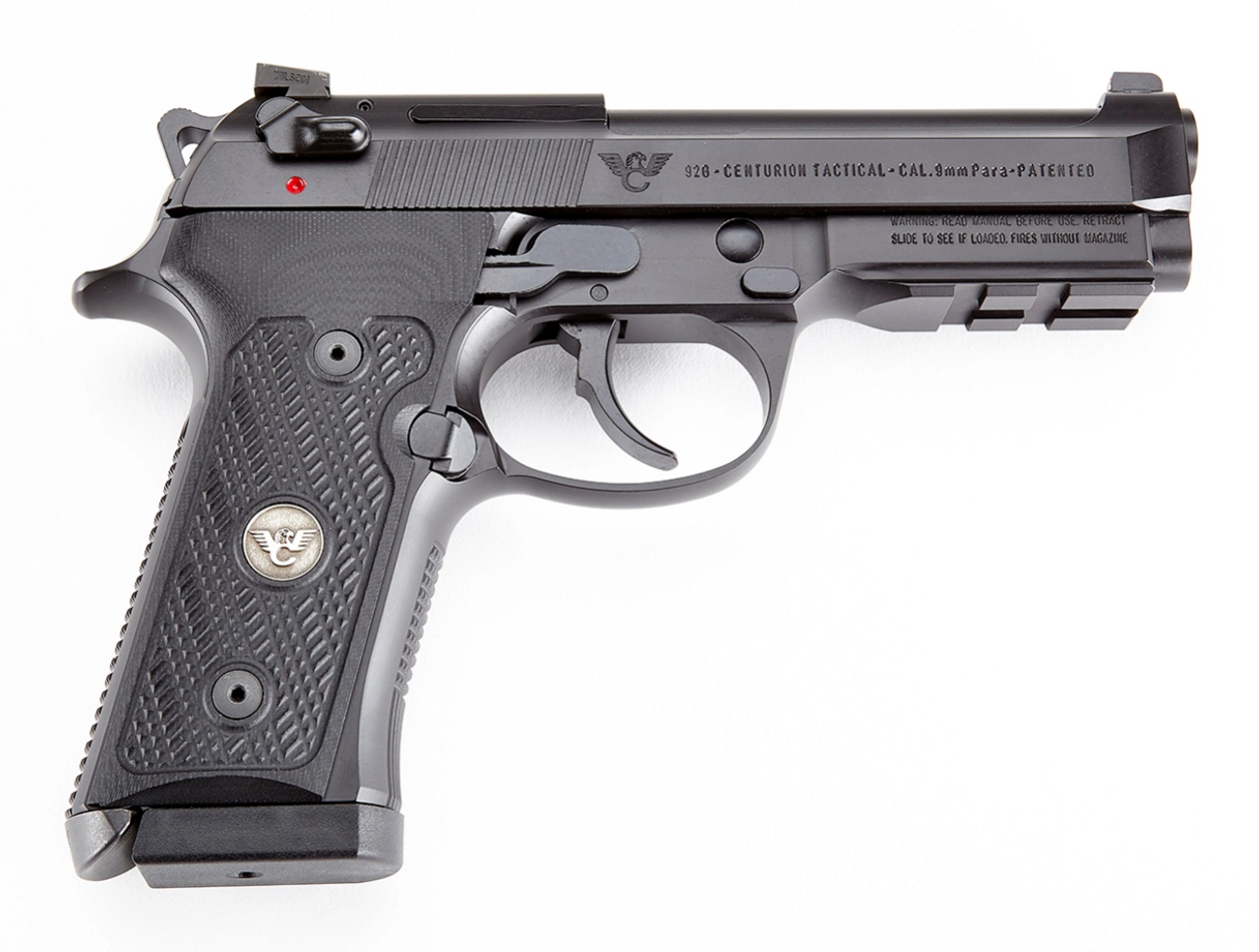 The 92G Centurion Tactical features all-steel Beretta and Wilson Combat custom parts. Some features of the limited-production 92G Centurion Tactical include steel ambidextrous decocker-only levers (G model), Centurion length slide, a modified M9A1-style checkered frame with accessory rail, and rounded trigger guard.