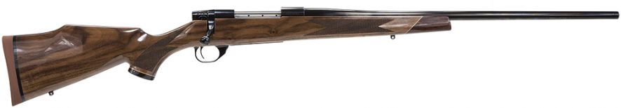 Weatherbys Vanguard rifles are guaranteed to shoot a 3-shot group of .99 or less at 100 yards (SUB-MOA) from a cold barrel when used with Weatherby factory or premium ammunition. Vanguard rifles are equipped with a match quality, two-stage trigger (adjustable down to 2.5 lbs.) and a 3-position safety, with the middle position allowing the shooter to work the action while safety is still engaged. The Vanguard action incorporates a one-piece machined bolt body, fluted for reduction in weight and bearing surface area, while eliminating binding for smooth action. Three gas ports allow high-pressure gases to escape laterally in the event of an accidental case rupture, and the massive M-16-style extractor ensures reliable and positive extraction. Vanguard rifles have a one-piece machined receiver featuring an integral recoil lug for the utmost in strength and structural integrity, along with a one-piece trigger guard with a hinged floorplate for easy access to unfired cartridges in the magazine. The Vanguard Deluxe model offers traditional styling while maintaining Vanguards dependable accuracy. The raised comb Monte Carlo stock is made of AA grade Claro walnut and features rosewood forend and grip caps with maplewood spacers, fineline checkering, and a high gloss finish. The chrome-moly metalwork has a high lustre blued finish.